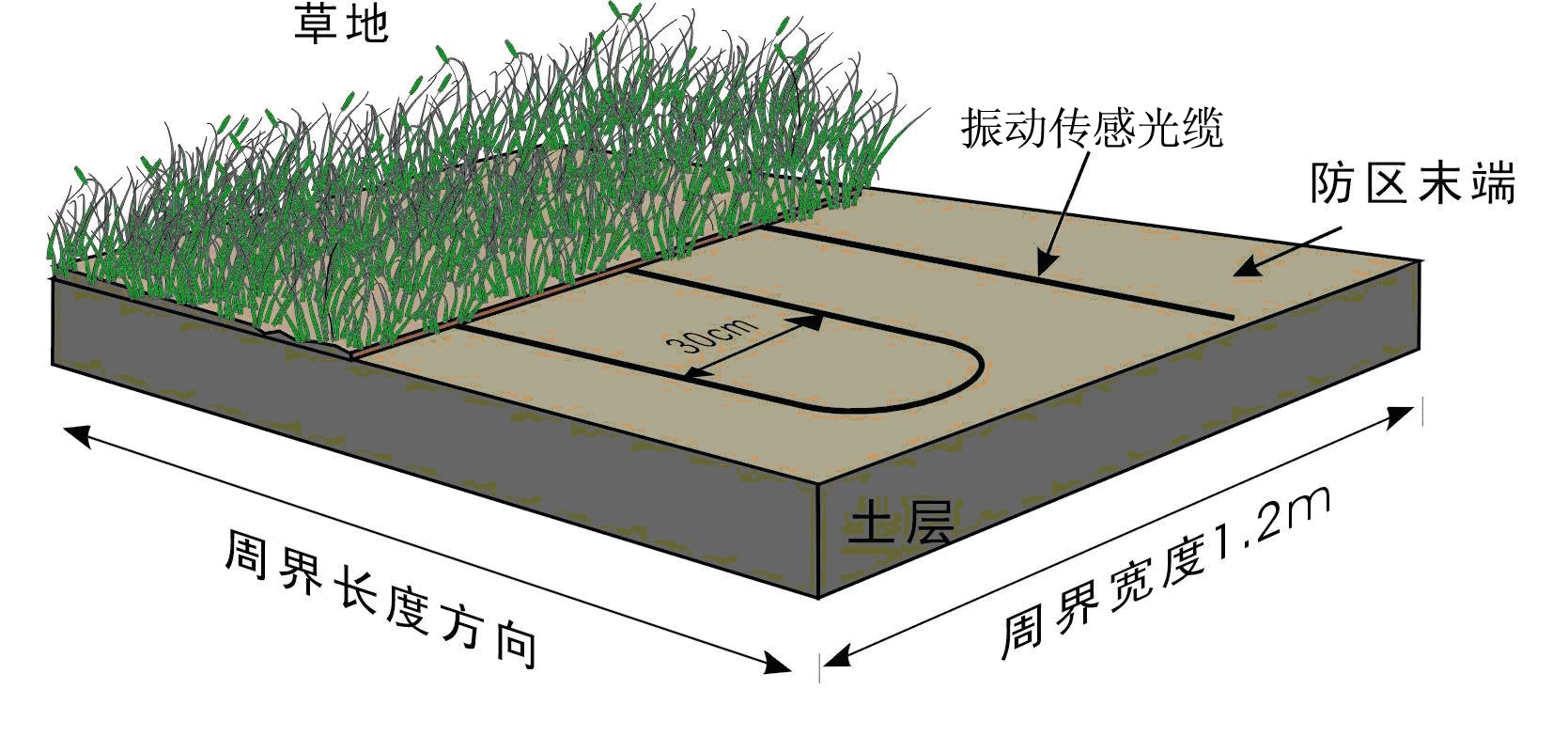 在沙土地下埋設(shè)振動傳感光纜時,也采用平行鋪設(shè)多道振動傳感光纜的鋪設(shè)方式,但由于沙土比較松軟,當(dāng)入侵者進(jìn)入該區(qū)域時,透過沙土層對振動傳感光纜施加壓力,振動傳感光纜可探測到微小的擠壓變形并產(chǎn)生信號,所以在沙土地埋設(shè)振動傳感光纜時,應(yīng)減少平行振動傳感光纜的間距,而且埋設(shè)不可過深。通常采用的間隔為20--25cm,埋設(shè)深度為5--10cm,如圖。在進(jìn)行施工時,首先在需要鋪設(shè)光纜的區(qū)域挖出一道寬1.2m,深10cm的凹槽,在凹槽的底部平鋪一層厚度為3cm的粗沙,再將振動傳感光纜平行鋪設(shè)于粗沙表面,每隔50cm用鋼絲線卡子固定。光纜鋪設(shè)完成后,在其上面覆蓋一層厚度為5cm的粗沙,最后在其表面均勻地覆蓋一層1--2cm的地表介質(zhì)(細(xì)沙或松散干燥的泥土)。